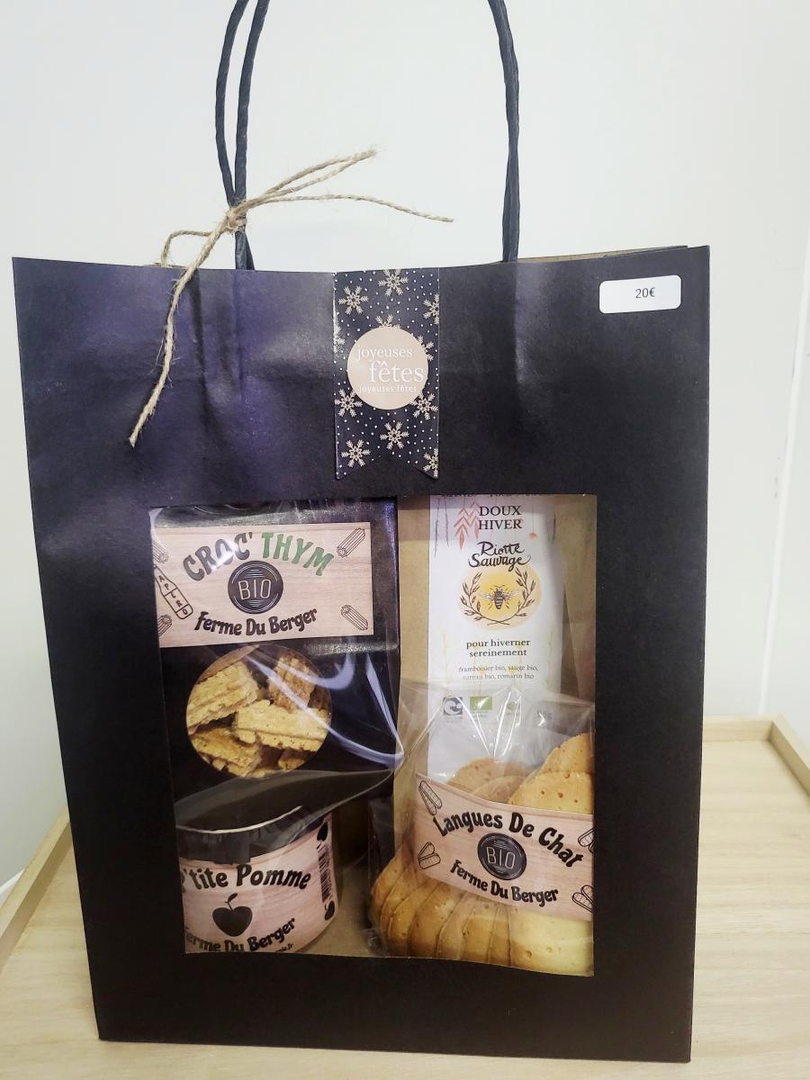 composé de: 1 paquet de biscuits apéritifs du Gaec du Berger, 1paquet de tisane , 1 compote de pomme, 1 paquet de tuiles ou étoiles de noel